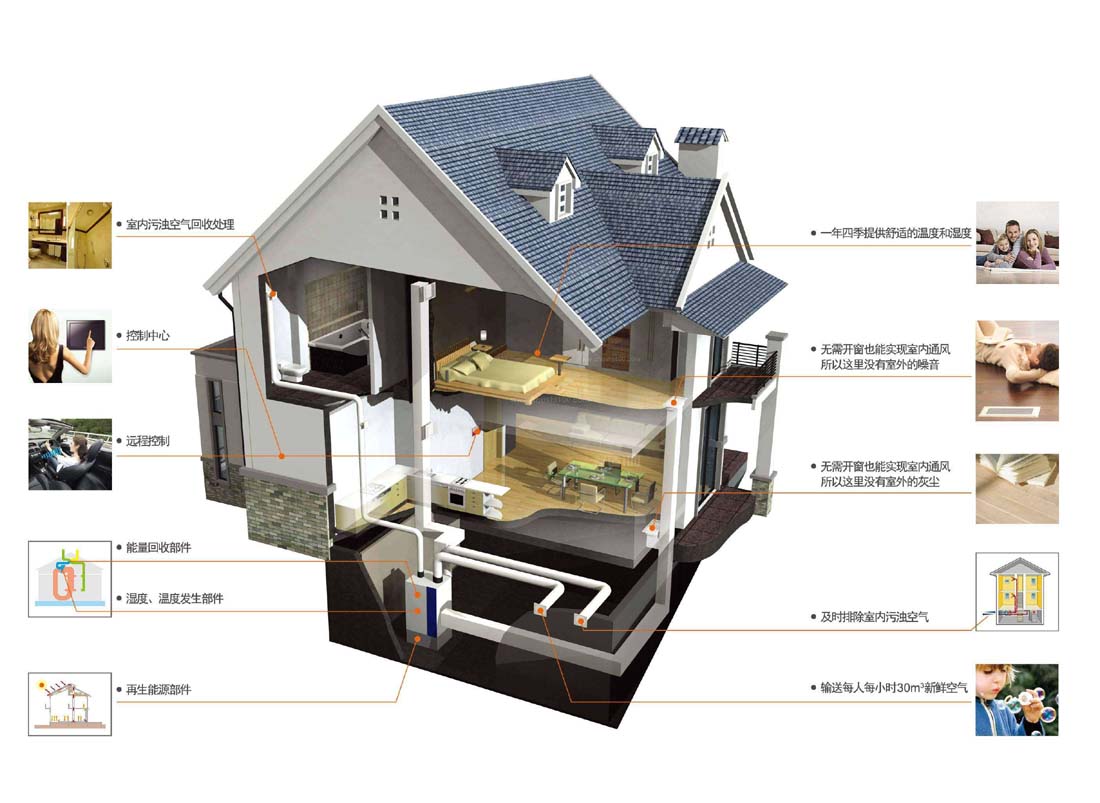 全屋新風系統(tǒng)能夠獨立的進行室內(nèi)空氣置換、凈化、流動系統(tǒng),在排除室內(nèi)的污染空氣的同時,輸入100%自然新鮮空氣,并將輸入室內(nèi)的新風經(jīng)過中效過濾、殺菌、增氧、滅毒、預(yù)熱(室外空氣較冷時)等多項處理后再送入室內(nèi)。家庭全屋新風系統(tǒng)的創(chuàng)新點是:用多臺新風機按空氣流動原理,組成“全屋新風系統(tǒng)“形成室內(nèi)新風流動場。系統(tǒng)營造的是一種時刻保持室內(nèi)空氣潔凈、清新的、呼吸無憂無慮的健康室內(nèi)環(huán)境。